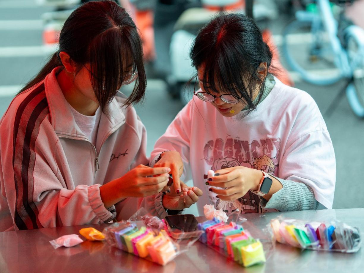 黏土“囤货”创作区中,在各色超轻黏土前,同学们捏出雪人等小物件,创意与巧思让冬日意象跃然指尖。制作完成后,大家举着凝聚着自己创意与心血的作品拍照留念,笑意里裹满了创作的成就感,现场充满了灵感碰撞的乐趣。