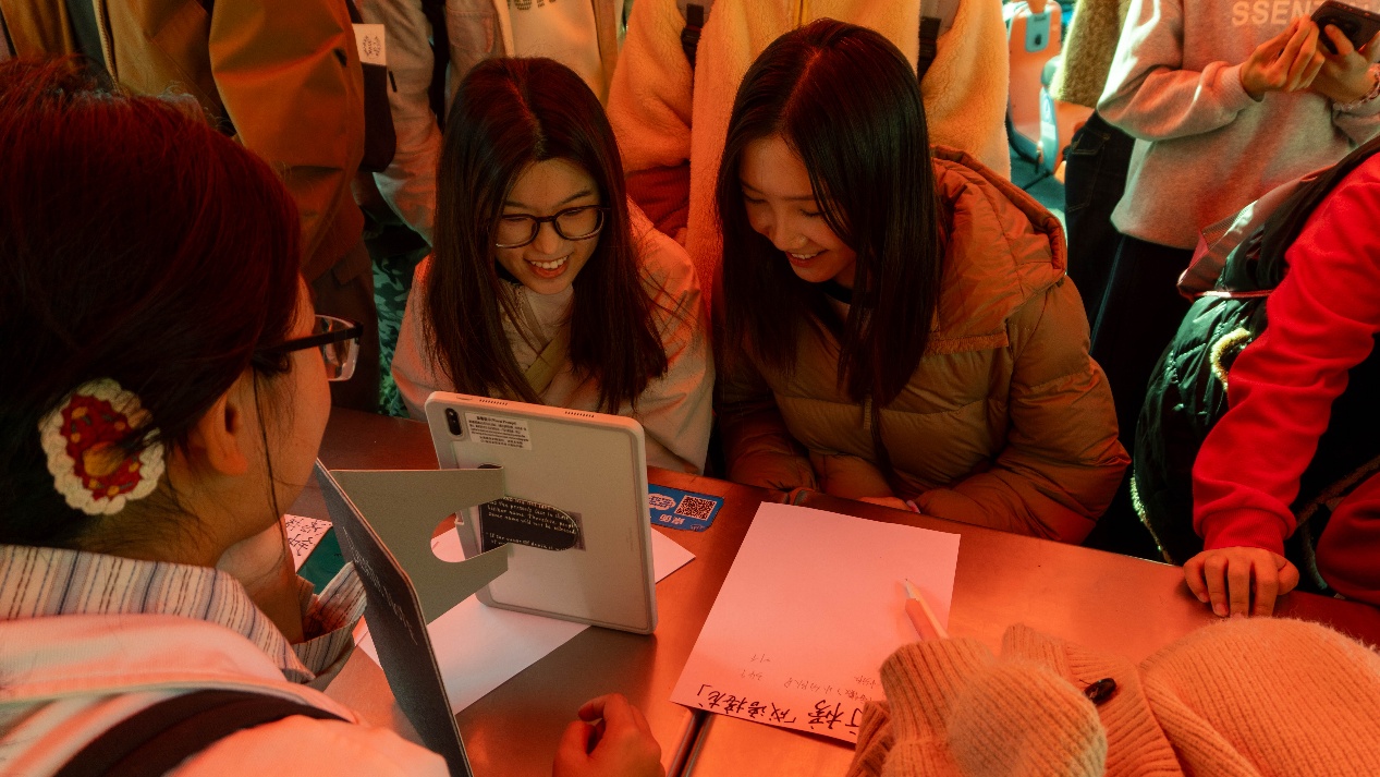 “相亲相爱成语接龙”现场欢声不断。同学们组队与人工智能“豆包”展开对决。五分钟限时内,队员们集思广益、互相提示,在紧张有趣的接龙中体会团队力量,真正诠释了“相亲相爱”的活动内涵。