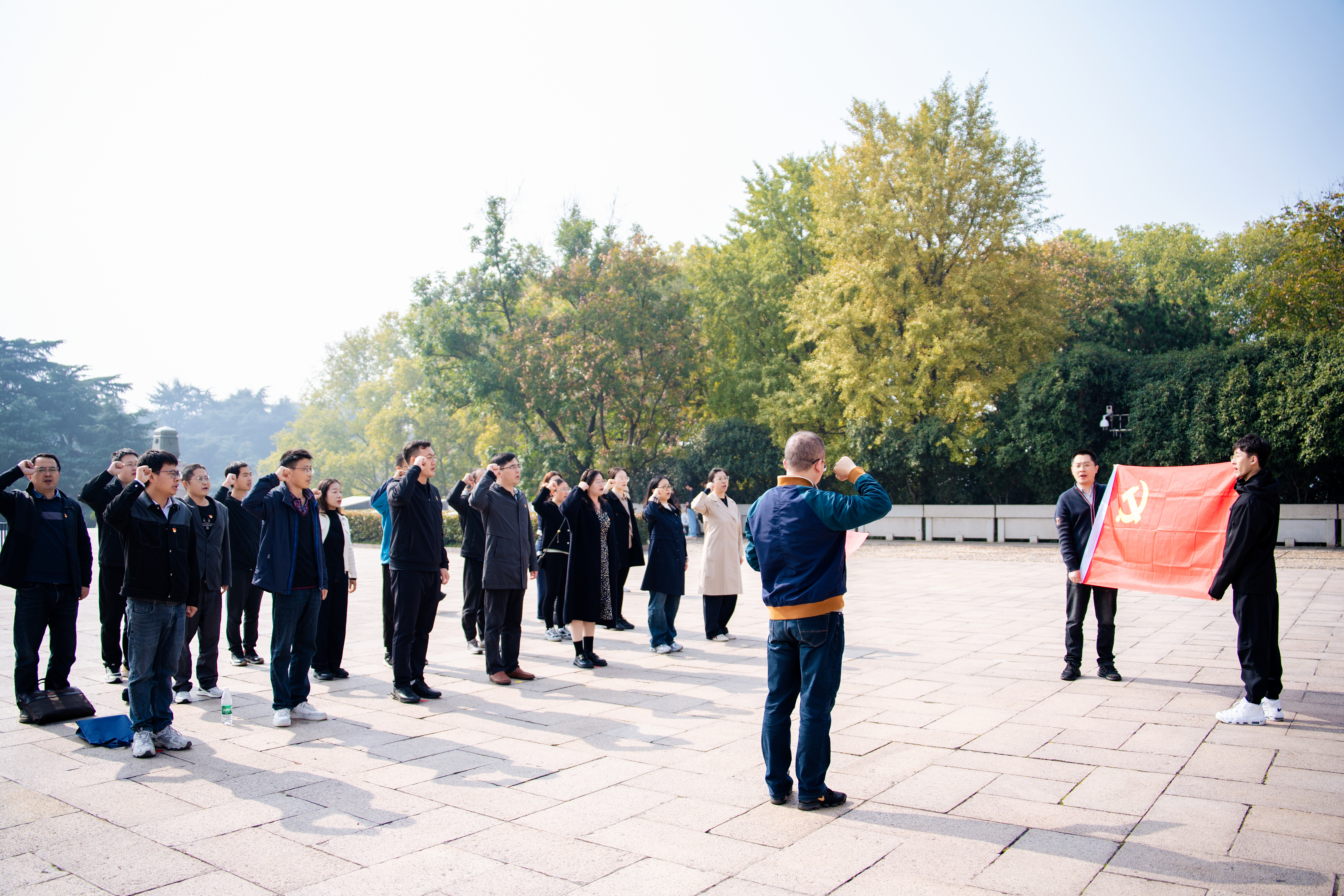 随后,全体人员在烈士纪念碑前肃立默哀,表达深切缅怀与崇高敬意。默哀仪式后,在鲜红的党旗下,大家高举右拳,重温入党誓词,铿锵有力的誓言回荡在纪念碑广场,不仅是对革命先烈的告慰,更坚定了新时代党员教师立德树人的使命担当。