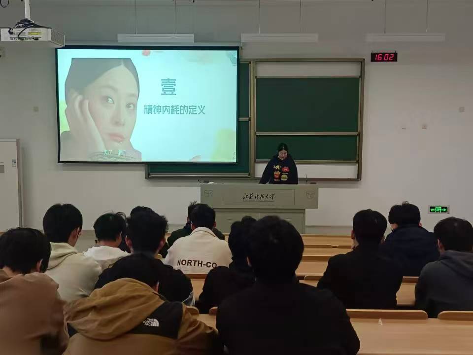 班会开篇,主持人以“是否为未完成任务焦虑”“是否纠结白天言行”的问题引发共鸣,顺利引入“精神内耗”主题。随后在“认识精神内耗”环节,她通过PPT从定义、表现、危害展开讲解,指出内耗是负面情绪与自我否定消耗心理能量,还结合考试失利后自我怀疑、过度担忧社交细节、拖延后自责等校园场景举例,强调长期内耗的危害。