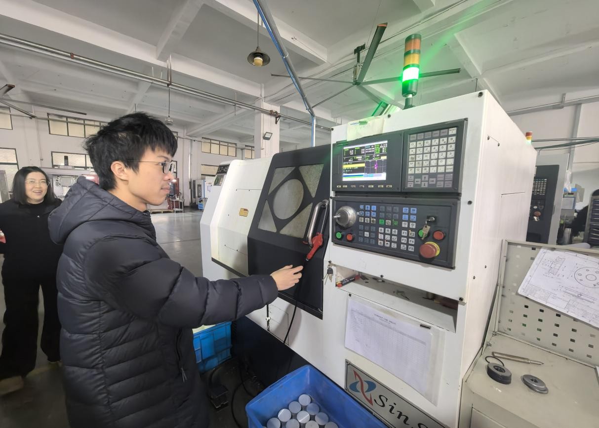 1月24日,实践团队长殷梓鸣在扬州银焰机械厂,完整观摩了喷煤粉燃烧系统关键部件——“喷煤嘴”从粗坯到精件的加工流程。车、铣、钻等多道工序的严谨衔接,让他深刻体会到工艺协同的重要性。“图纸上的线条变成实物,需要无数工艺的精准把控,”他感慨道。