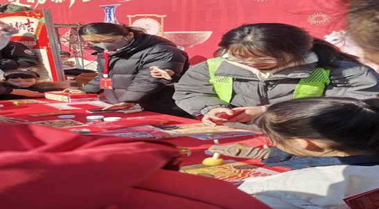 2月8日,唐爱涵以志愿者身份参与江苏宝应县新春游园盛宴,在县博物馆非遗拓印摊位,唐爱涵一边维持秩序,一边讲解拓印步骤,指导参与者制作创意红包、对联及风铃。
