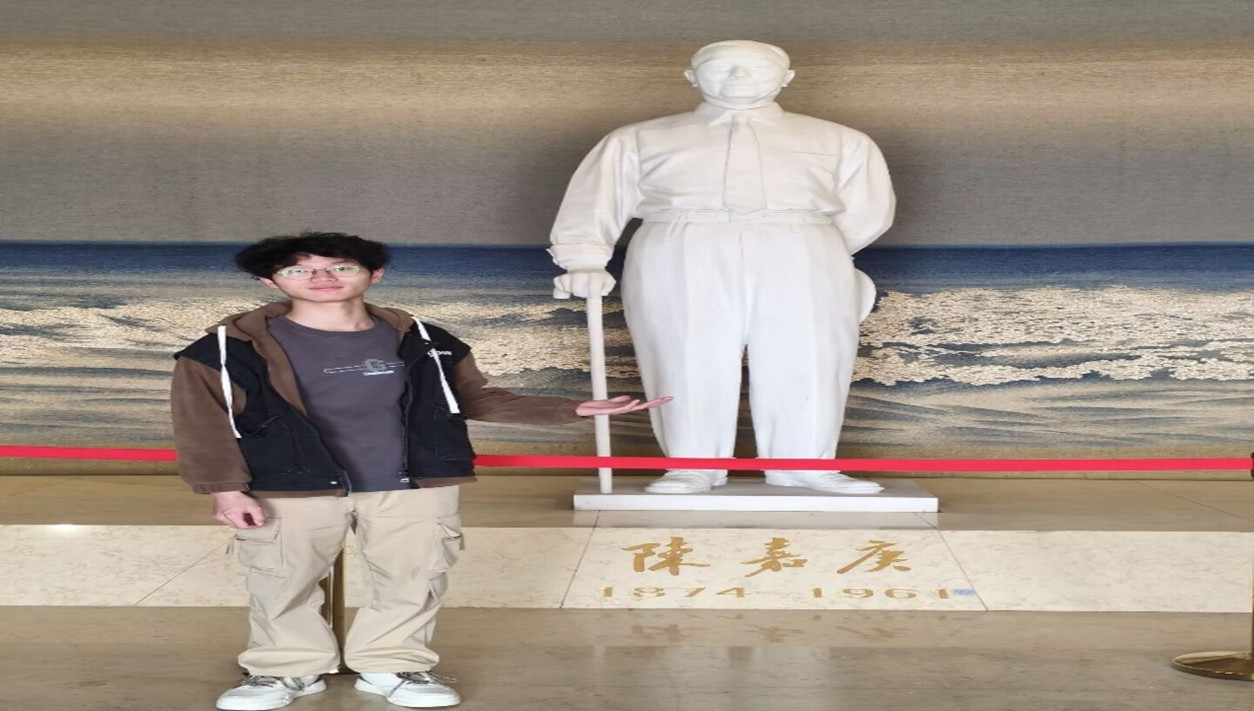 刘杭鑫在第一展馆与陈嘉庚纪念雕塑合影