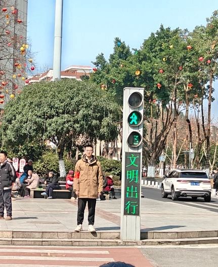 2月12日,队员吴靖轩在路口开展文明交通志愿服务,坚守在红绿灯旁,认真引导行人和车辆有序通行。以认真负责的态度维护交通秩序,用实际行动传递文明出行理念,展现了志愿者的责任与担当。